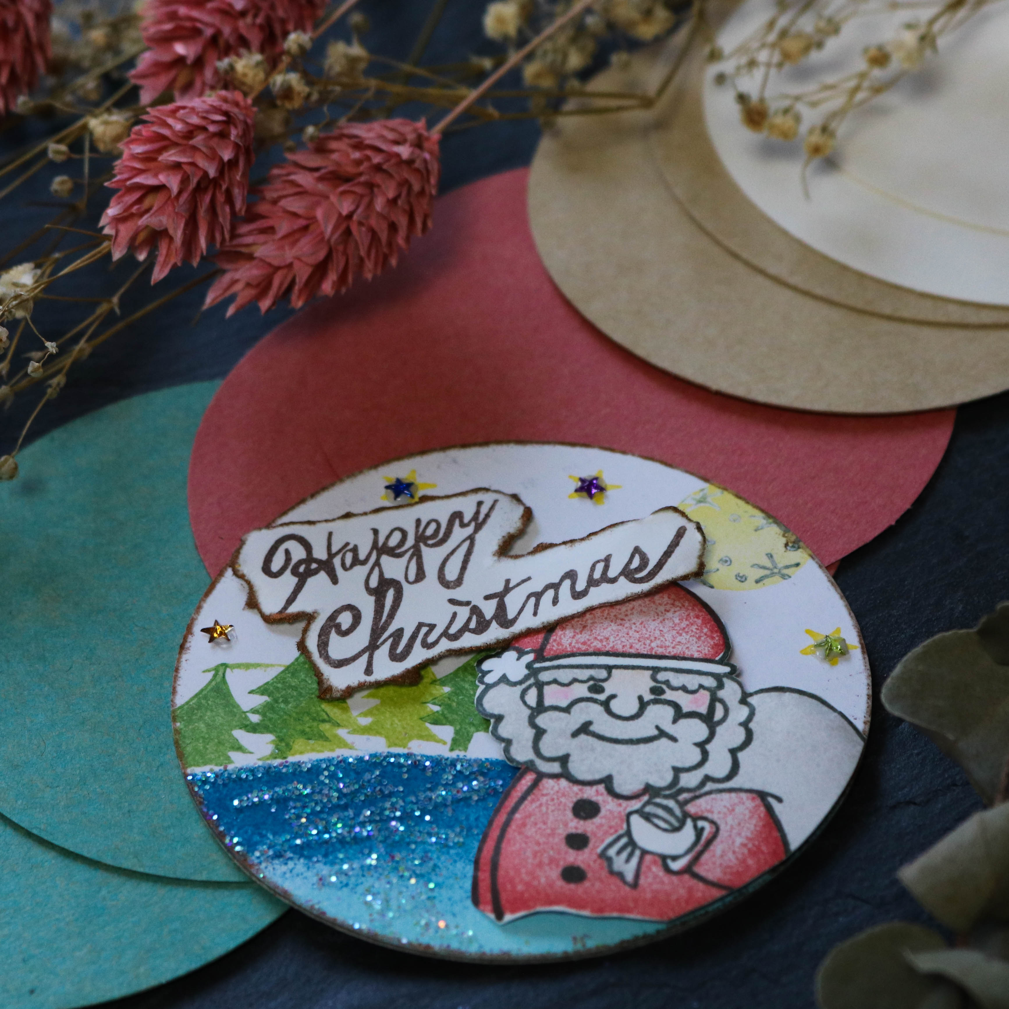 ・テーマは『クリスマス』・台紙サイズ:直径2.5インチ(63.5mm)の円形